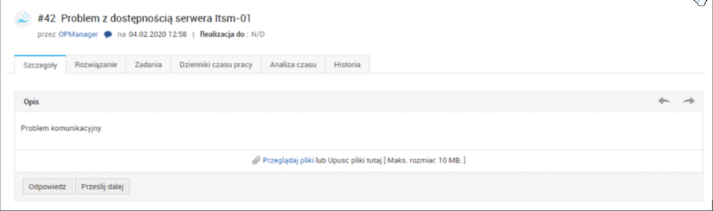 W tym wypadku OPManager podczas odpytania serwera nie dostał żadnej odpowiedzi. OPManager wysyła więc automatycznie zgłoszenie do systemu ServiceDesk.
