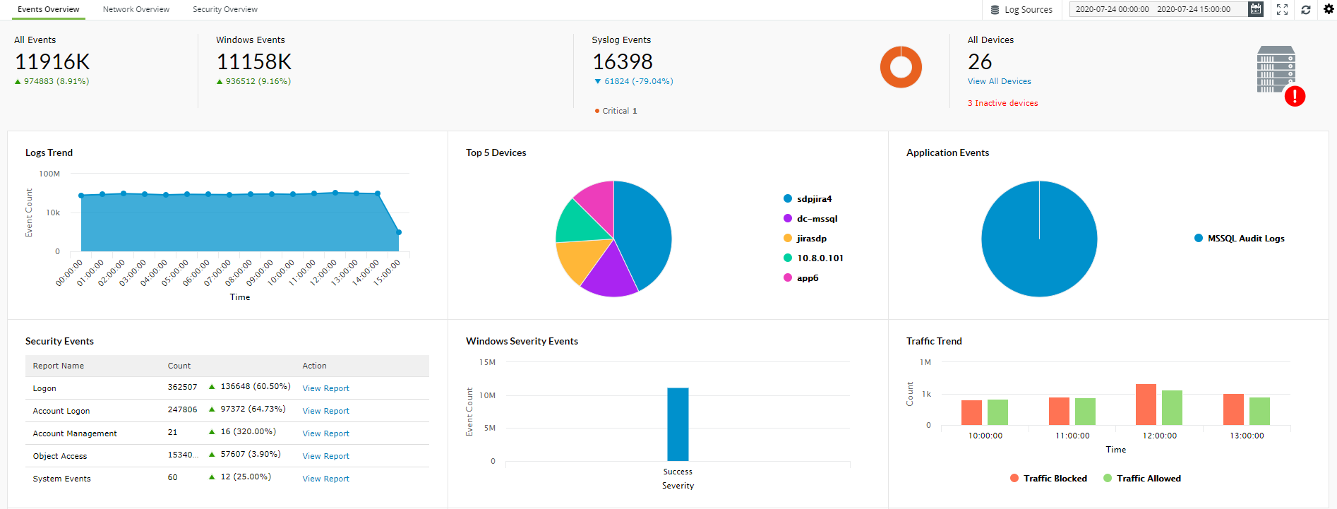 Log360 jako system SIEM’owy jest kompleksowym rozwiązaniem do zarządzania informacjami o bezpieczeństwie i zdarzeniach. Pomaga monitorować sieć i infrastrukturę IT oraz zapewnia alerty w czasie rzeczywistym i gotowe raporty. Dostarcza krytyczne raporty na podstawie zdarzeń, urządzeń, połączeń zdalnych i nie tylko.