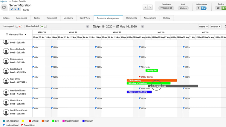 Przy dużej liczbie zadań i ustalaniu terminów rozpoczęcia oraz realizacji może pojawić się problem związany z odpowiednim skoordynowaniem w czasie. W tym celu ManageEngine przygotowało graficzne rozwiązanie, które nie tylko umożliwia podgląd zadań przypisanych do poszczególnych osób związanych z projektem. Umożliwia również zmianę ich terminów za pomocą funkcji „drag and drop”.