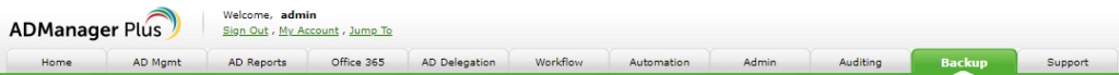 Zarządzanie środowiskiem Active Directory zostało wzbogacone o nową funkcję- tworzenie kopii zapasowej oraz jej przywracanie. ManageEngine umożliwiło tę opcję także w ADManager Plus, dodając nową zakładkę „Backup”.