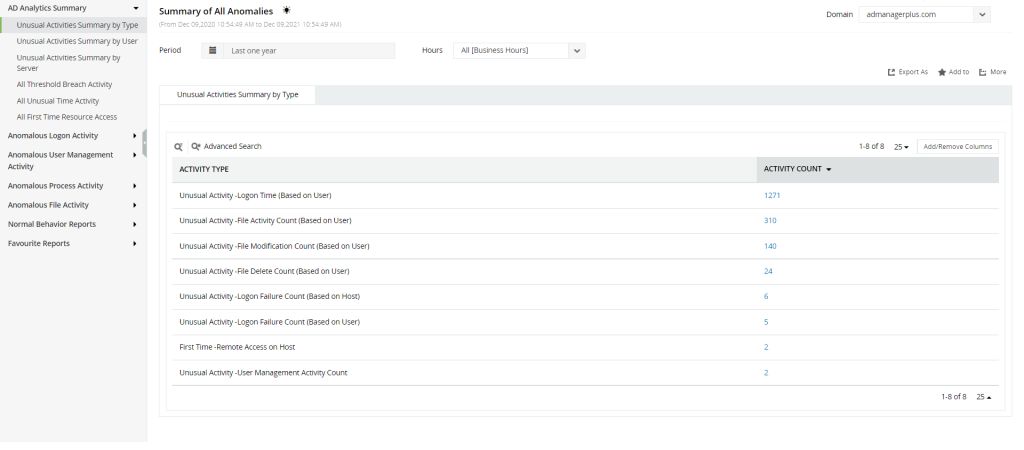 • Wykrywa nietypowe działania użytkowników, takie jak nietypowy czas lub liczba blokad konta, dzięki analizie zachowań użytkowników.