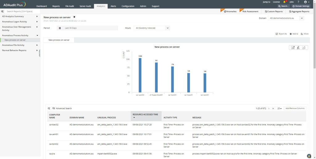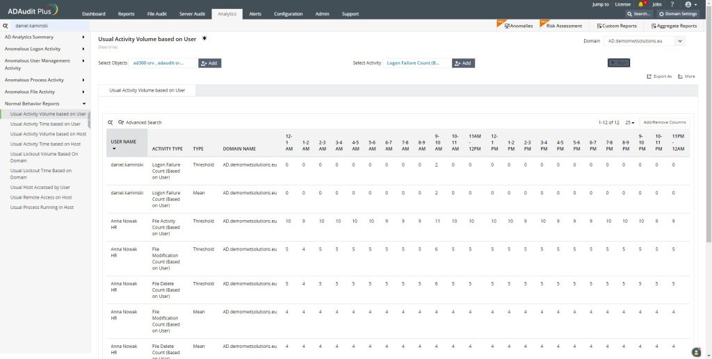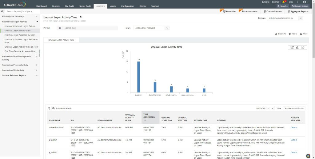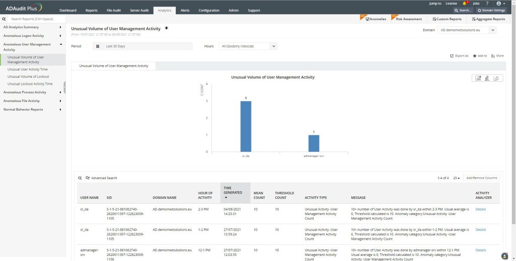 ADAudit Plus przy użyciu zakładki Analytics pozwala na analizę zachowań użytkowników. Oprogramowanie to wykorzystuje uczenie maszynowe, aby stworzyć linię bazową normalnych działań, które są specyficzne dla każdego użytkownika. Dzięki temu, moduł ten wykrywa potencjalne zagrożenia, które są odstępstwem od normy. Narzędzie pozwala wykryć wszelkiego rodzaju anomalie. Następnie informuje dla jakiego użytkownika wystąpiła taka zależność i jakie zmiany zostały dokonane. Dzięki temu w szybki sposób będziemy mogli na to zareagować.