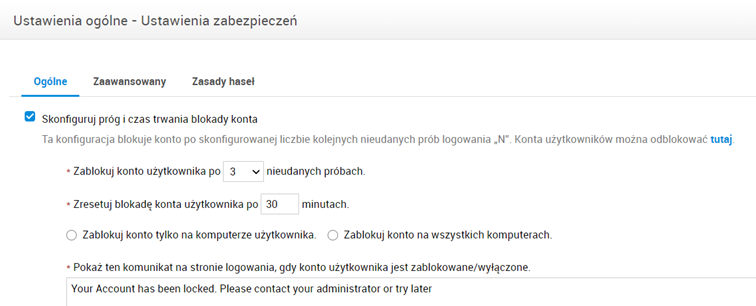 Wszystkie powyższe konfiguracje można wprowadzić w Administracja > Ustawienia Ogólne > Ustawienia Zabezpieczeń > Zaawansowany.