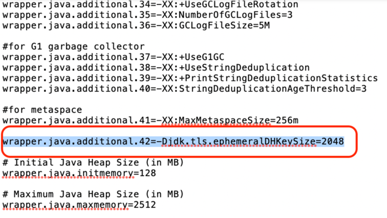 Skonfiguruj Javę tak, aby używała 2048-bitowej grupy Diffie-Hellman. Ustaw jdk.tls.ephemeralDHKeySize na „2048” w parametrach JVM (np. -Djdk.tls.ephemeralDHKeySize=2048).
