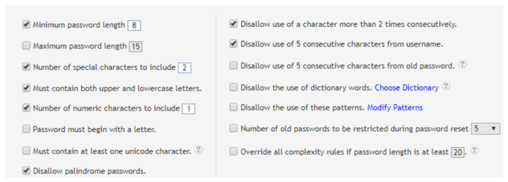 Mamy możliwość ustawienia podstawowych elementów złożoności haseł oraz możemy rozszerzyć je również o dodatkowe własności, takie jak: